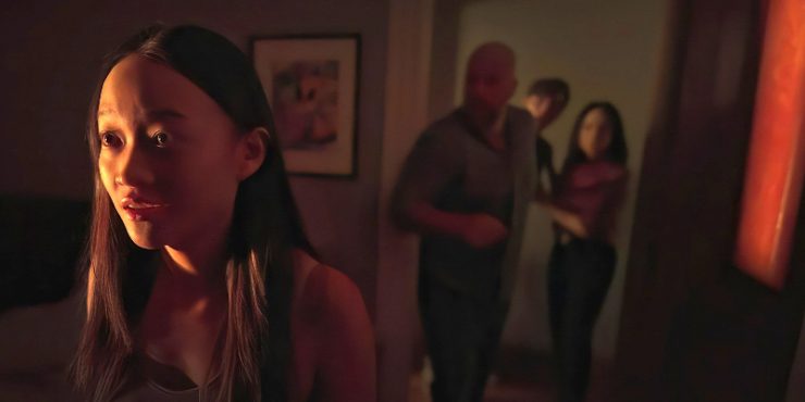 The movie is about a family of four who moves into an old but charming Northeastern home. Rebecca (Lucy Liu) is a business woman who may end up in legal trouble very soon, and her husband, Chris (Chris Sullivan), is her hangdog husband debating whether he wants to stay aboard the sinking ship. Their son, Tyler (Eddy Maday), is a star swimmer and the apple of Rebecca’s eye, but their daughter, Chloe (Callina Liang), is a troubled drug user whose best friend just died from taking synthetic fentanyl. The new house has the humility of an aged home, but the expanse of something more elegant. It seems perfect. What they don’t realize is that it houses a poltergeist, who watches their every move, never leaving the home. We vicariously witness the families plurality of dramas: Rebecca’s oncoming comeuppance, Chris’s existential crisis, Chloe’s grief. The camera has a sense of attachment to these people, but what that attachment is only reveals itself over time.