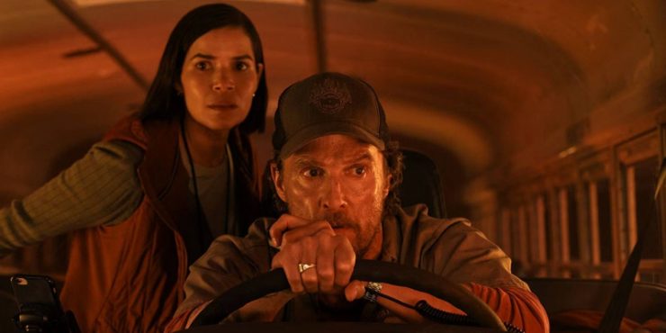 Which is why, when his films are bad, they feel exceptionally so. So many of his scripts (which he occasionally writes or co-writes) are conventionally constructed, and he seems compelled to the challenge of making them feel “realistic”. That his non-Bourne movies are often based on actual events only contributes to his compulsion toward creating a living history. This can produce interesting results, but can also feel like glib experiments exploiting real tragedy. His latest, The Lost Bus, is “inspired” by a true story of a deadly brush fire in Paradise, California in 2018. “Inspired” is probably the worst of the nonfiction idioms that essentially fictional films use to give themselves credibility. In the case of The Lost Bus, a single segment from a Lizzie Johnson’s book about the 2018 camp fire is the source material. It’s meant to be the story of bus driver Kevin McKay (played by Matthew McConaughey), and his treacherous journey to evacuate a busload of children through the engulfing flames.